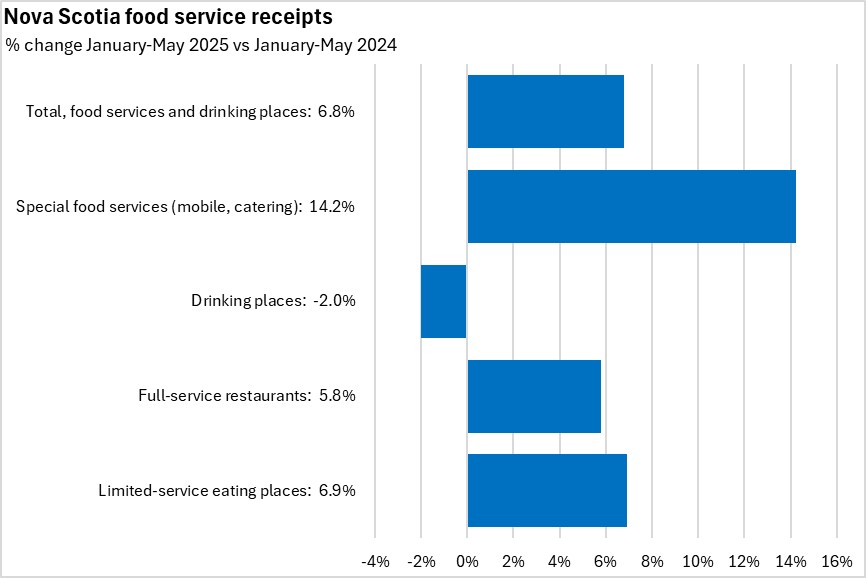 Nova Scotia's year-to-date gains in food service receipts (in value terms) are mainly attributable to the increases in limited and full service eating places, while there were also smaller rises at special food services (mobile, and catering). Nova Scotia drinking places reported slightly lower year-to-date receipts compared to the same period last year.
