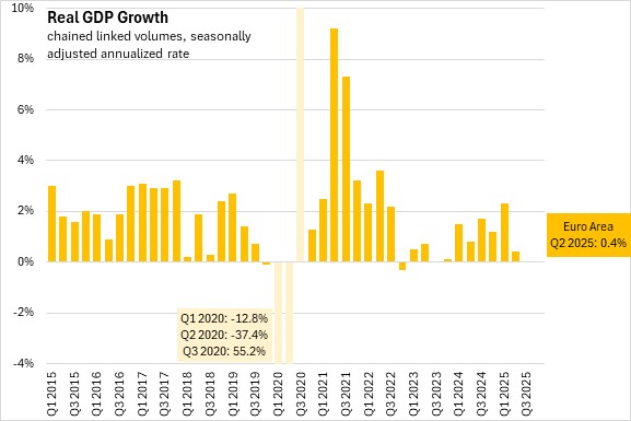 In the preliminary flash GDP estimate for Q2 2025, the seasonally adjusted annualized growth rate for real GDP was +0.7% for the European Union and +0.4% for the Euro Area (a subset of 20 of the 27 nations of the European Union).