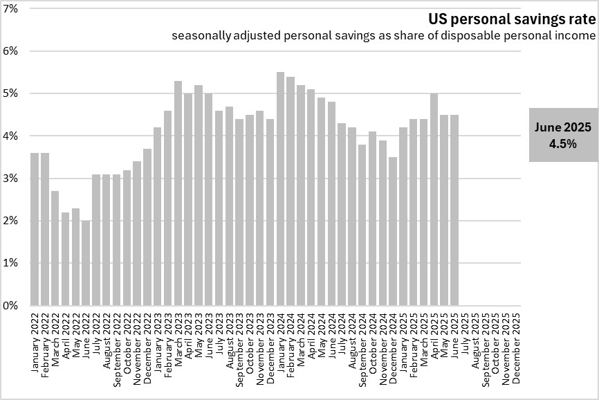With similar growth rates for personal income and personal consumption the US personal savings rate remained steady at 4.5% of disposable personal income in June 2025.