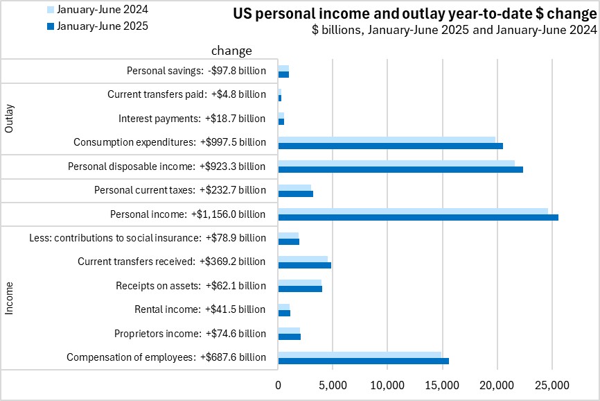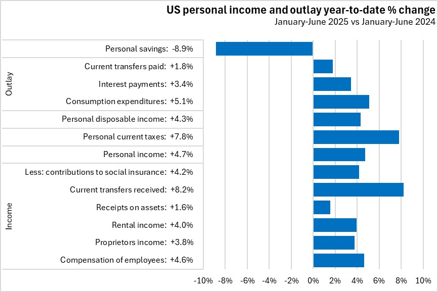 In the first six months 2025, US personal income increased by 4.7% from the same period in 2024. There were gains from all income sources led by growth in current transfers received (+8.2%). Personal consumption expenditures grew by 5.1%. Personal savings declined 8.9%.