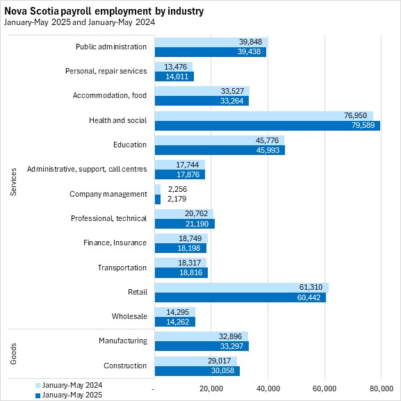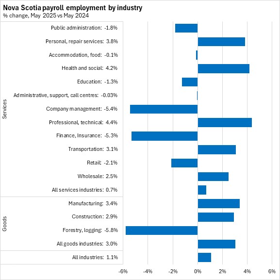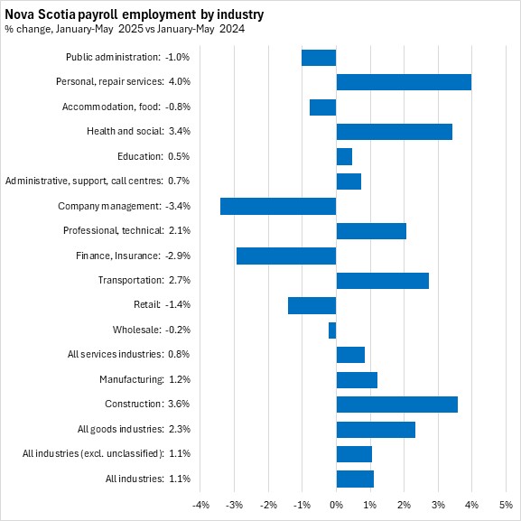 Personal/repair services, construction, and health care/social assistance reported the fastest growth in payroll employment in the first five months of 2025 in Nova Scotia. The fastest declines were reported in company management and finance/insurance.