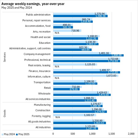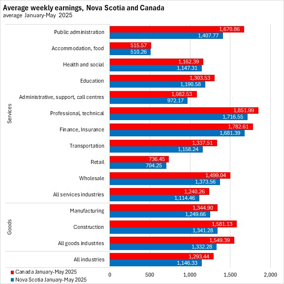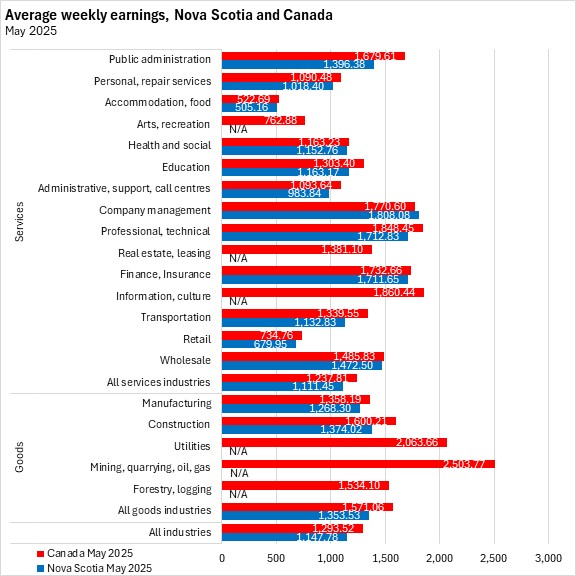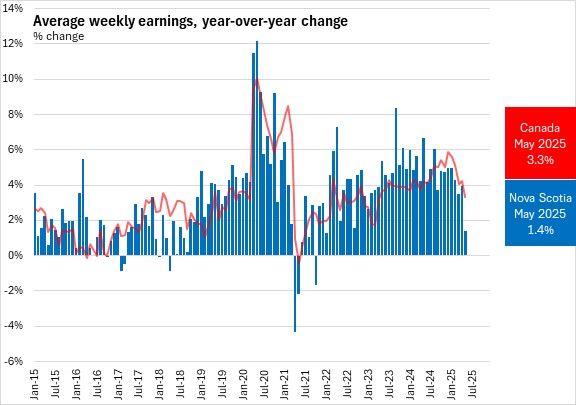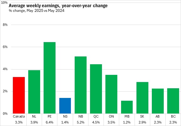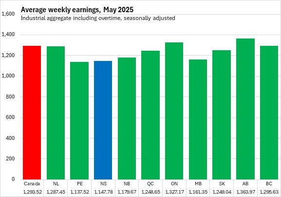 Nova Scotia's average weekly earnings in May 2025 were second lowest among provinces, ahead of Prince Edward Island. Alberta reported the highest average weekly earnings.
