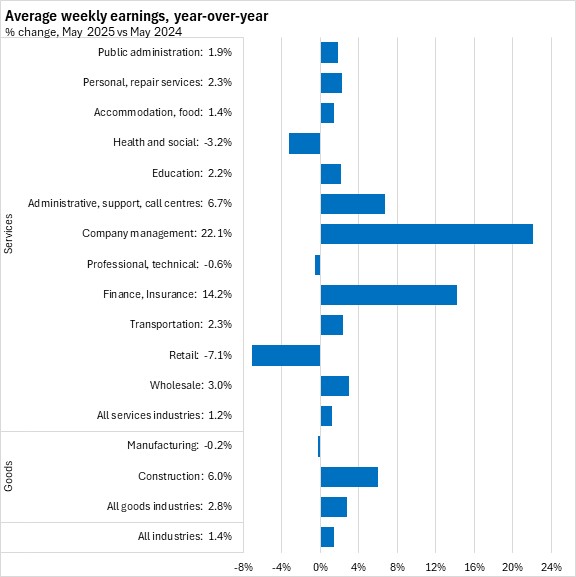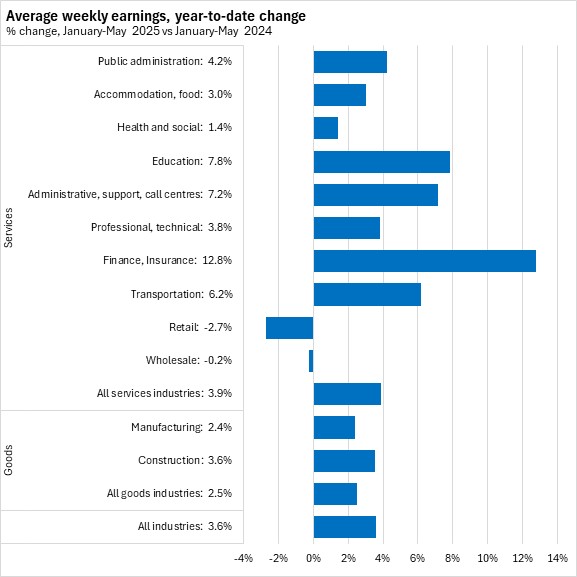 Average weekly wages grew by 3.3% across Canada from May 2024 to May 2025. There were gains in each province, with the fastest increase in Prince Edward Island. Manitoba reported the slowest gain.
