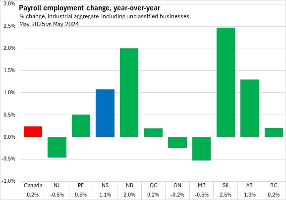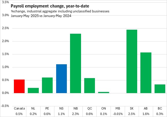 In the first five months of 2025, Nova Scotia's payroll employment increased 1.1%. This was faster than the national average of 0.5% as all provinces reported growth except Manitoba. The fastest year-to-date growth was reported in Saskatchewan and New Brunswick.