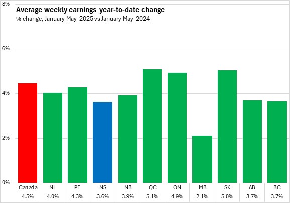 In January-May 2025, average weekly earnings grew 3.6% in Nova Scotia compared to the same period last year. National average weekly earnings grew 4.5% with all provinces reporting growth over this period. Québec and Saskatchewan reported the fastest growth while Manitoba reported the slowest.