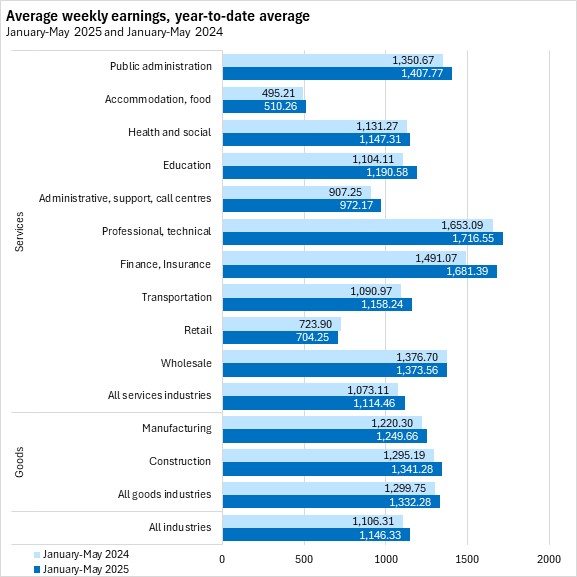 Nova Scotians' average weekly earnings were $1,147.78 in May 2025, a decline of $2.41 (-0.21%) from April 2025.