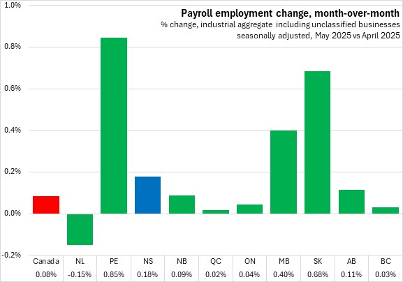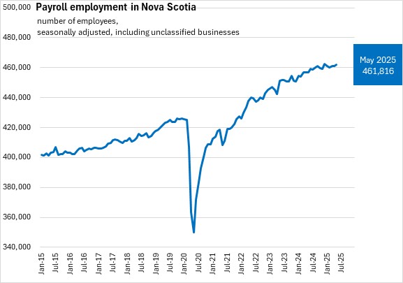 Nova Scotia had 461,816 payroll employees in May 2025, up 0.18% (+823) compared to April 2025. Canada had 18.25 million employees, up 0.08% from April 2025. There were gains in all provinces except Newfoundland and Labrador. The fastest gains were reported in Prince Edward Island and Saskatchewan.