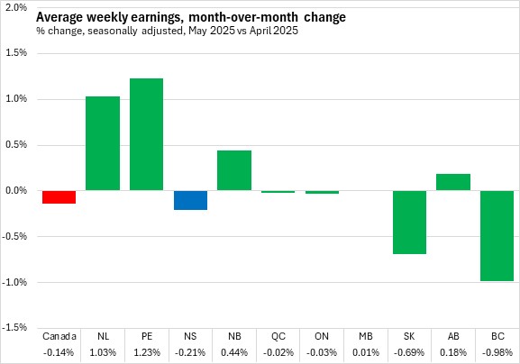 Nationally, average weekly earnings were $1,293.52, a decline of 0.14% (-$1.77) from average weekly earnings in April. Five provinces reported gains in average weekly earnings, with the fastest gain in Prince Edward Island. The fastest decline was reported in British Columbia.