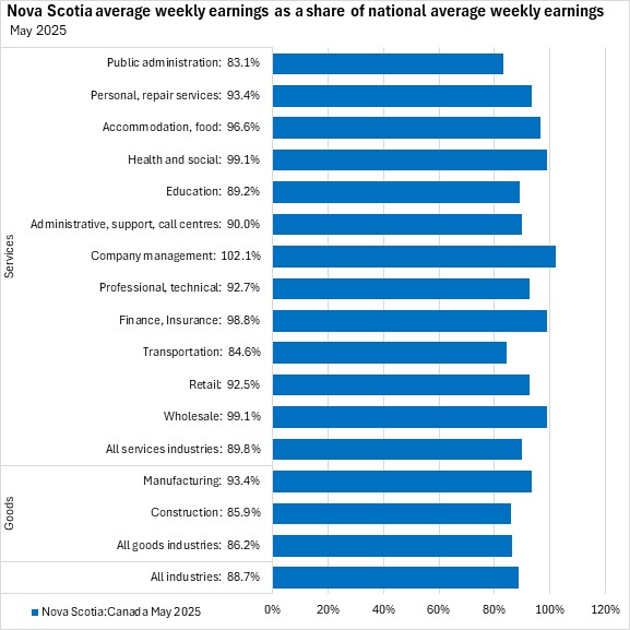 In May 2025, Nova Scotia's average weekly wages were 88.7% of the national average. Nova Scotia average weekly wages were below the comparable national average for every industry except company management. The smallest gaps were reported among health/social assistance and wholesale trade. The largest gap was reported in public administration (83.1% of the national average).
