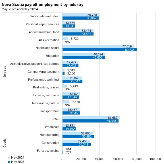 (Note: data are not available for Nova Scotia's utilities and mining sectors, and were not available in May 2025 for: forestry/logging, information/culture, real estate/rental/leasing, and arts/entertainment/recreation.)