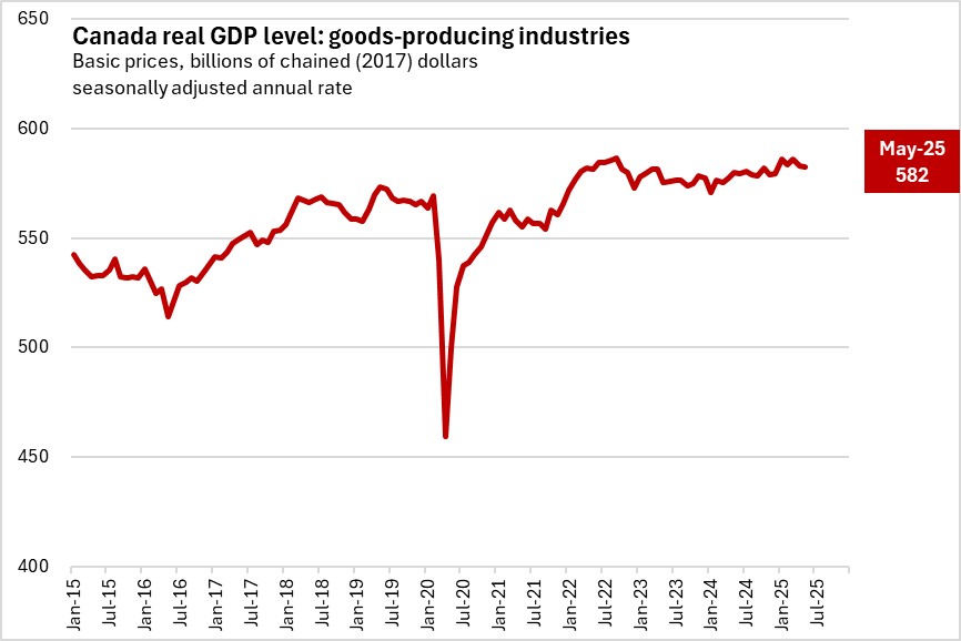 Real GDP in Canada's goods producing industries decreased 0.1% from April to May 2025.
