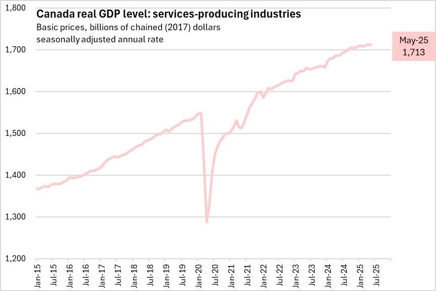 Real GDP in Canada's services-producing industries edged down 0.04% from April to May 2025.