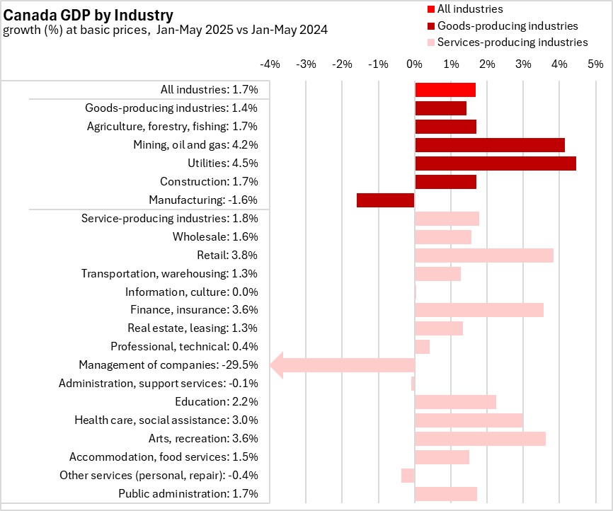 The Canadian economy was 1.7% larger in January-May 2025 when compared to the same months in 2024.