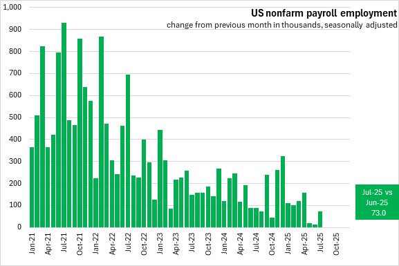 The increase of 73,000 in US nonfarm payroll employment was stronger than the revised growth of 14,000 reported for June and 19,000 in May 2025.