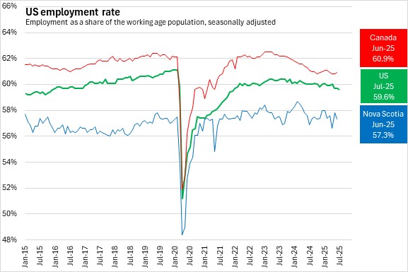 The US employment to population ratio decreased 0.1 percentage points to 59.6% in July 2025. As with the participation rate, the US employment rate remains below pre-pandemic levels and has declined slightly since mid-2023.