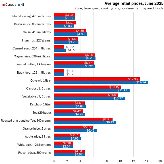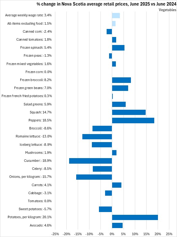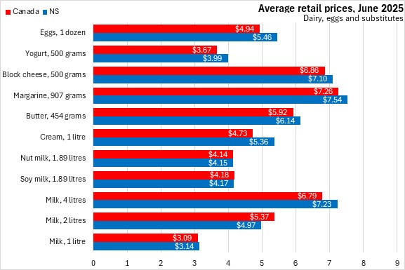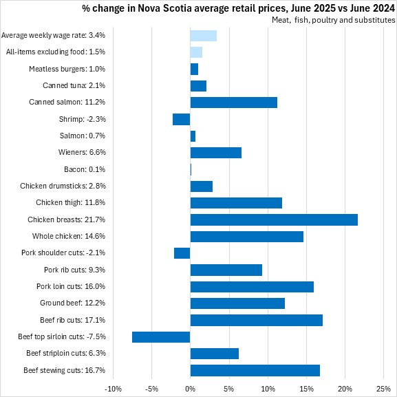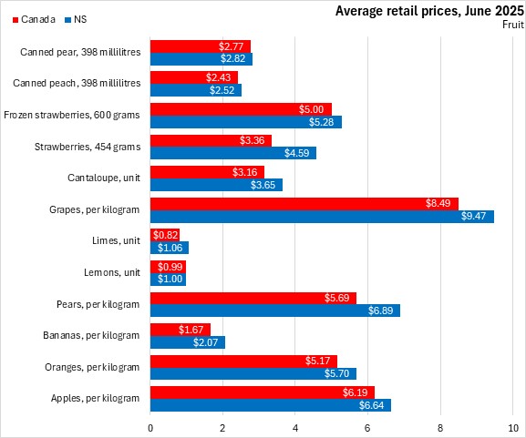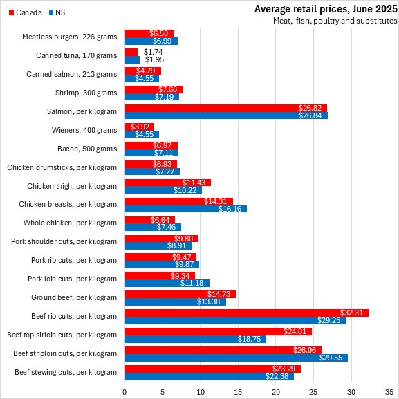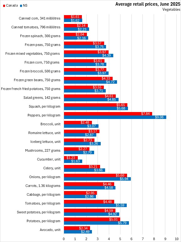 Nova Scotia food prices were more than 10% higher than the national averages for the following products: beef striploin, pork loin, chicken (whole, breasts), wieners, canned tuna, cream, eggs, bananas, pears, limes, grapes, cantaloupe, strawberries, oranges, potatoes, tomatoes, celery, cucumber, mushrooms, iceberg lettuce, broccoli, peppers, frozen mixed vegetables, flatbread, white rice, vegetable oil, canola oil, canned soup.