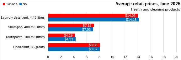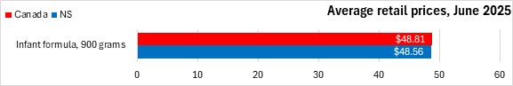 Nova Scotia food prices were below national averages for the following products: beef (stewing, sirloin, rib, ground), pork shoulder cuts, chicken thigh, shrimp, canned salmon, milk, soy milk, cabbage, romaine lettuce, white sugar, baby food, infant formula, pasta sauce, salad dressing, deodorant, shampoo.