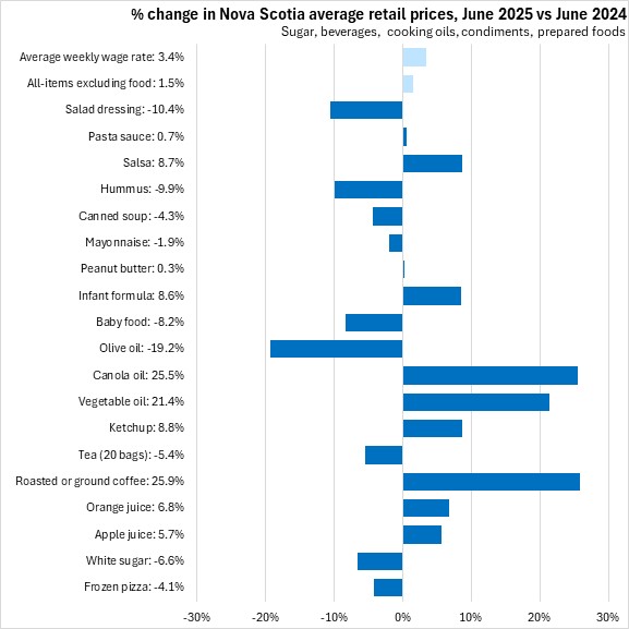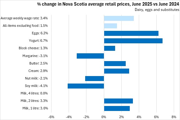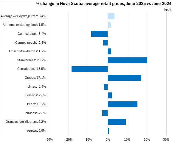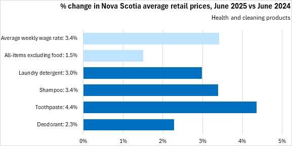 Over the last year (June 2025 vs June 2024), the consumer price index for all items in Nova Scotia excluding food increased by 1.5%. Food prices as a whole rose 2.1%. At the same time average weekly earnings across all Nova Scotia industries increased by 3.4%.