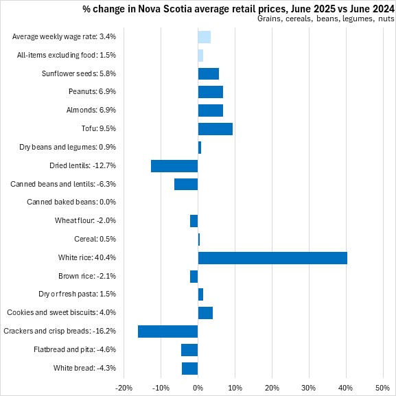 In the last year, the following products reported lower prices in Nova Scotia: beef top sirloin, pork shoulder, shrimp, milk, soy milk, nut milk, margarine, bananas, limes, cantaloupe, sweet potatoes, tomatoes, cabbage, onions, celery, cucumber, lettuce (iceberg and romaine), broccoli, frozen goods (corn, peas, pizza), white bread, flatbread, crackers, brown rice, wheat flour, white sugar, tea, olive oil, baby food, mayonnaise, canned goods (baked beans, soup, beans, lentils, corn, peach, pear) dried lentils, hummus, salad dressing.