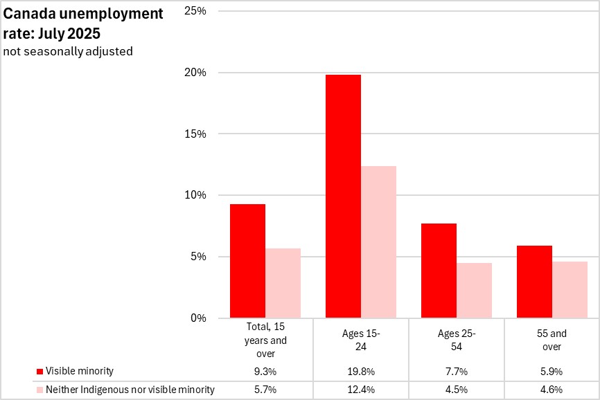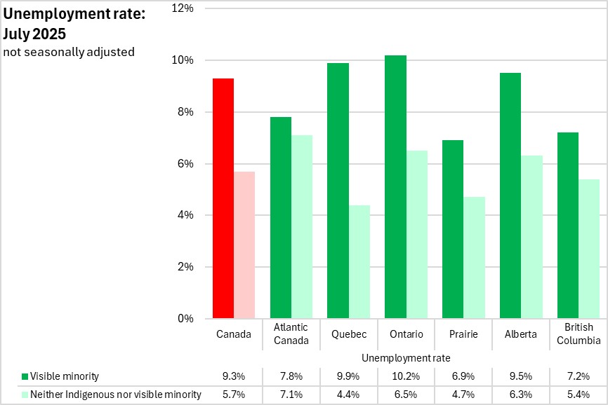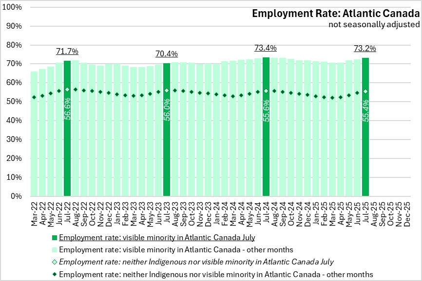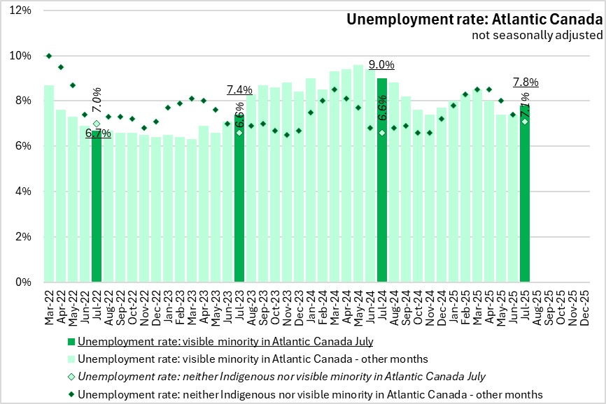In July 2025, the unemployment rate for the visible minority population was higher compared to the population that was neither Indigenous nor in a visible minority population in Atlantic Canada.
