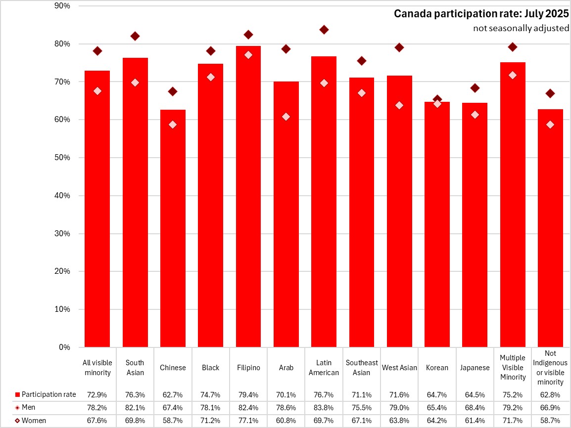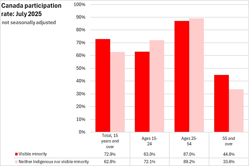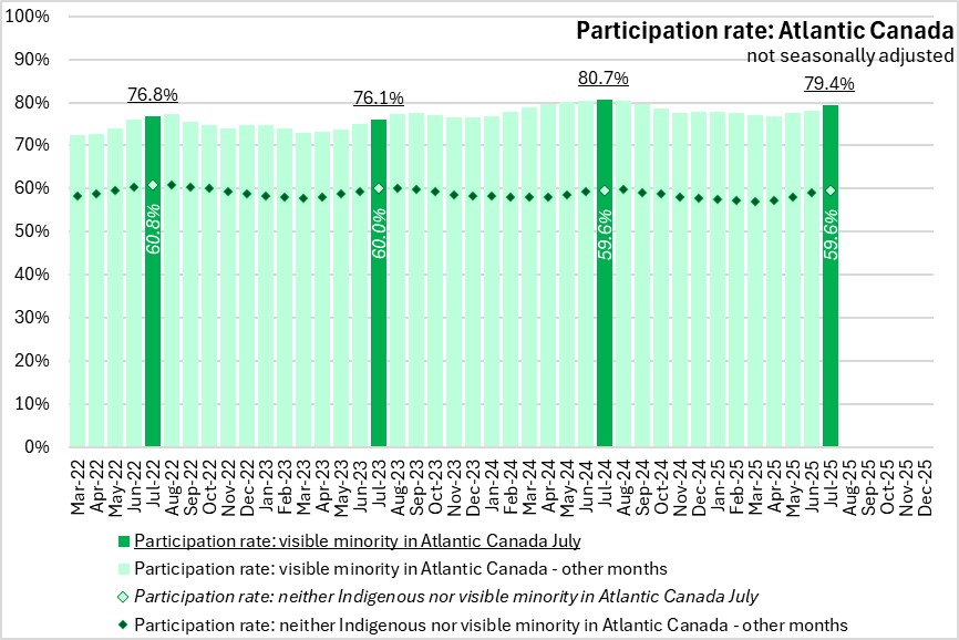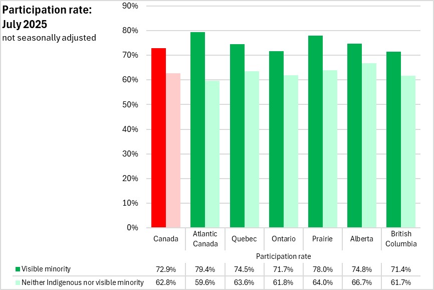 National participation rates were higher for those who identify with a visible minority population (72.9%) than for those that did not identify as Indigenous or in a visible minority population (62.8%). Participation rates of those who identify with a visible minority population were higher in all regions in July 2025. In Atlantic Canada, those who identify with a visible minority population reported a 79.4% participation rate, compared to a 59.6% participation rate for those that do not identify as Indigenous or in a visible minority population, the largest gap among regions.