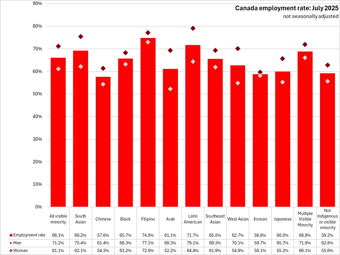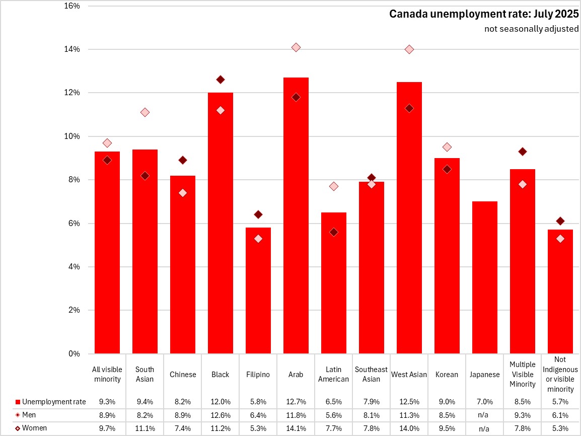In July 2025, the unemployment rates of males in all visible minority populations were lower (8.9%) than for females in visible minority populations (9.7%), which was not the case for populations that did not identify as Indigenous or visible minorities. Among specific populations, female unemployment rates were lower than males among Chinese, Black, Filipino, and Southeast Asian as well as for those that identified with multiple visible minority populations.
