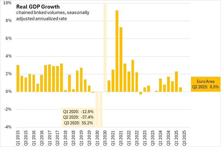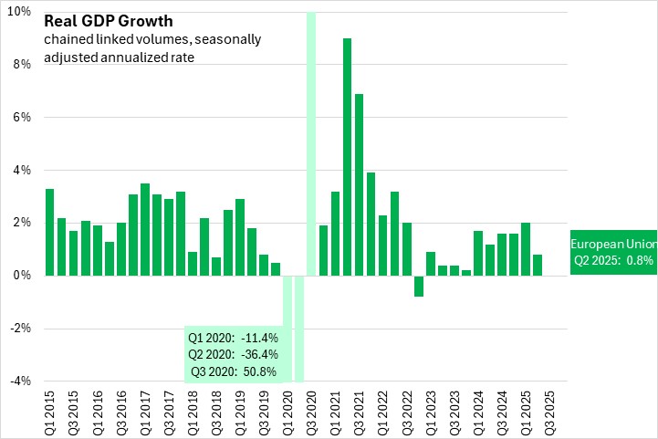 In the second GDP estimate for Q2 2025, the seasonally adjusted annualized growth rate for real GDP was 0.8% for the European Union and 0.5% for the Euro Area (a subset of 20 of the 27 nations of the European Union).