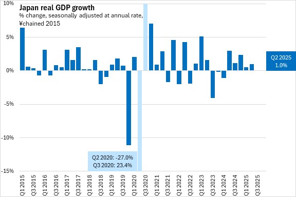 First estimates indicate that the Japanese economy (real GDP) grew at a seasonally adjusted annualized rate of 1.0% in the second quarter of 2025. This was an acceleration from growth in the first quarter, which was revised up to 0.6%.