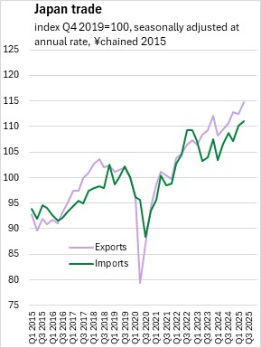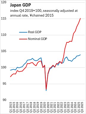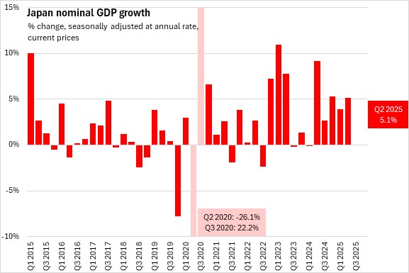Japan's nominal GDP was estimated at 5.1% (seasonally adjusted annualized rate) in Q2 2025, accelerating from 3.9% in Q1 2025. The price deflator for Japan's real GDP (the broad measure of price growth) increased at a seasonally adjusted annualized rate of 4.0% in Q2 2025, accelerating from 3.3% in the first quarter.