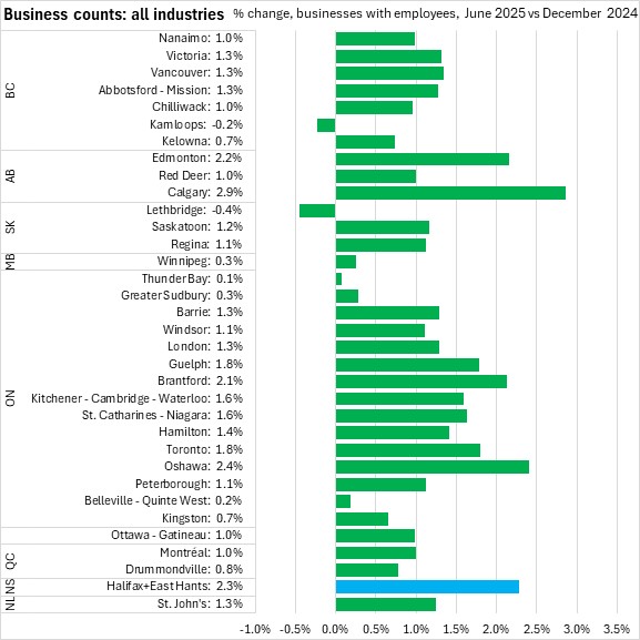 Among Canada's Census Metropolitan Areas (CMA), Halifax and East Hants reported a 2.3% increase in business counts across all industries and sizes, trailing only Calgary and Oshawa. Kamloops and Lethbridge posted the only declines in business counts.