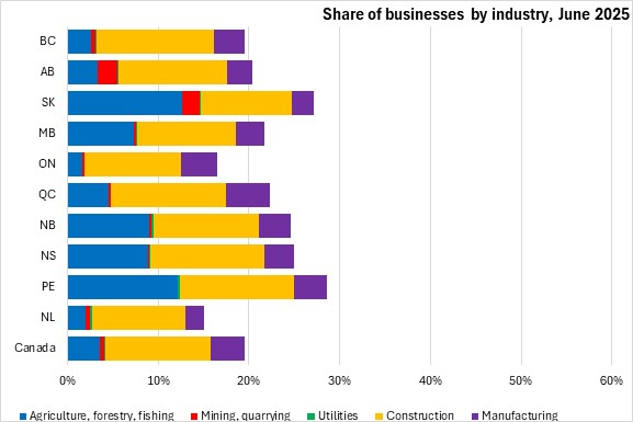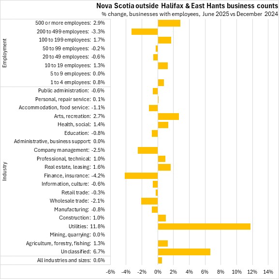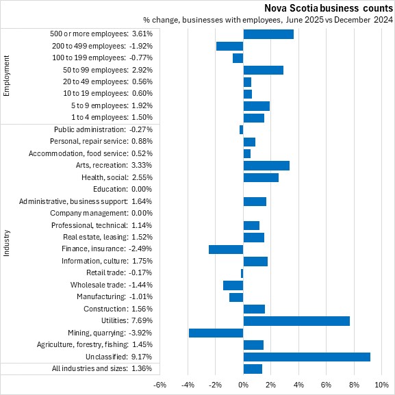 Among Nova Scotia's industries (apart from unclassified businesses), business counts in utilities reported the largest percentage gains from December 2024 to June 2025. Declines were reported in business counts among Nova Scotia's public administration, finance/insurance, retail trade, wholesale trade, manufacturing and mining/quarrying industries.