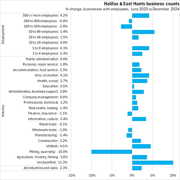 In the Halifax and East Hants Census Metropolitan Area, agriculture/forestry/fishing, utilities, arts/recreation, information/culture and health/social had the fastest growth in business counts (among industries for which classifications were available). in Halifax/East Hants business counts were down for mining/quarrying, manufacturing, wholesale trade, retail trade and finance/insurance.