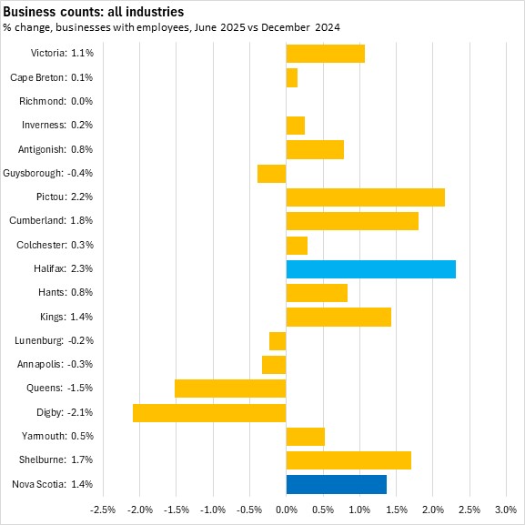 Among Nova Scotia's counties, Halifax and Pictou reported the fastest percentage growth in business counts from December 2024 to June 2025. Of the 5 counties reporting declining business counts, Digby and Queens Counties reported the sharpest declines.
