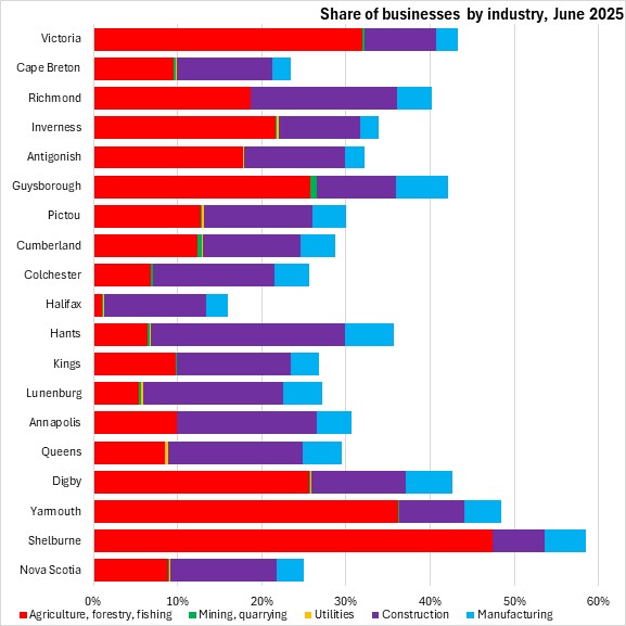 Among Nova Scotia's counties, goods-businesses are a larger share of total business counts in Shelburne, Yarmouth, Digby, Guysborough, Richmond and Victoria counties (notably from agriculture, forestry and fishing).