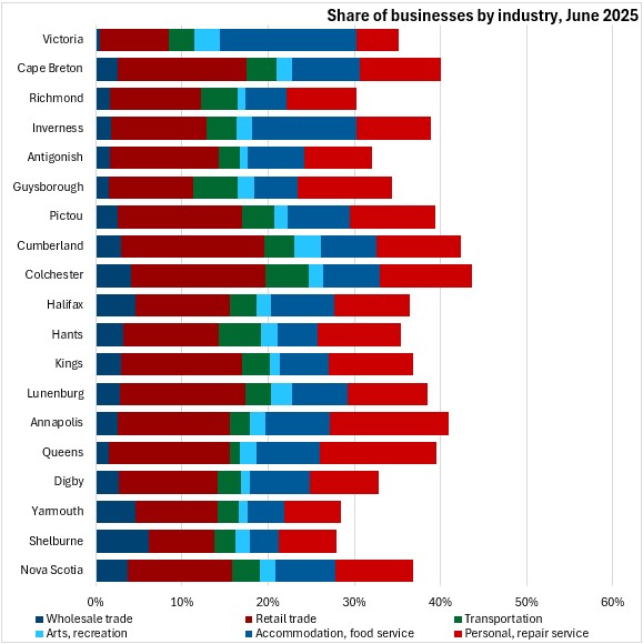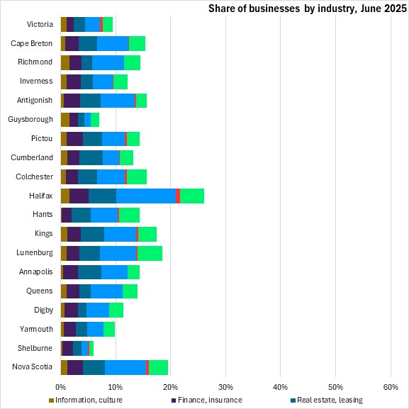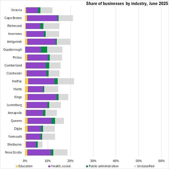 Health, social, education and public administration businesses were larger shares of all businesses in Halifax, Antigonish, Cape Breton, Kings and Queens counties.