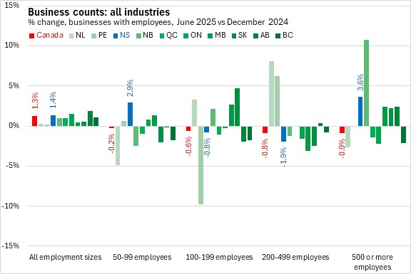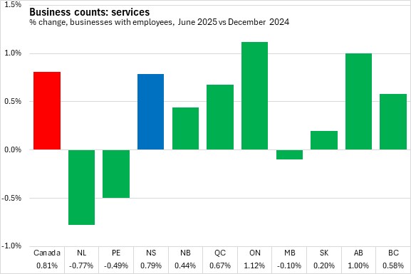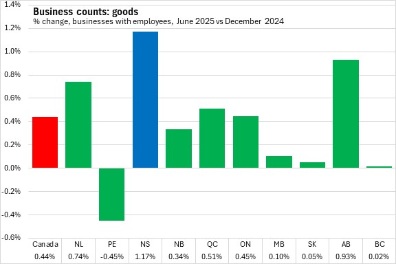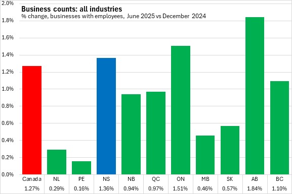 August 15, 2025BUSINESS COUNTS, JUNE 2025 The number of business locations in Nova Scotia with employees increased 1.36% between December 2024 and June 2025. Across Canada, business counts increased by 1.27% with gains in all provinces. Alberta and Ontario reported the fastest growth in business counts over this period (followed by Nova Scotia). Growth was slowest in Prince Edward Island.