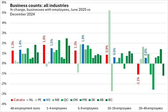 Across Canada, all categories of medium and large employers (20-49, 50-99, 100-199, 200-499 and 500+) reported falling business counts. Canadian business counts were up only for those with 20 or fewer employees (1-4, 5-9 and 10-19), though this was sufficient to generate overall growth in business counts in Canada.