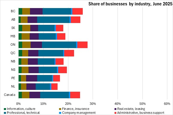 Real estate, finance, professional services, information and culture, company management as well as administrative and business support businesses are notably more concentrated in Canada's four most urban provinces: Ontario, British Columbia, Alberta and Québec.