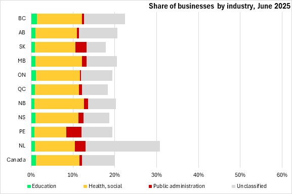 Health, social, education and public administration businesses make up a similar share of business counts across most provinces. Newfoundland and Labrador reported a higher portion of unclassified businesses.