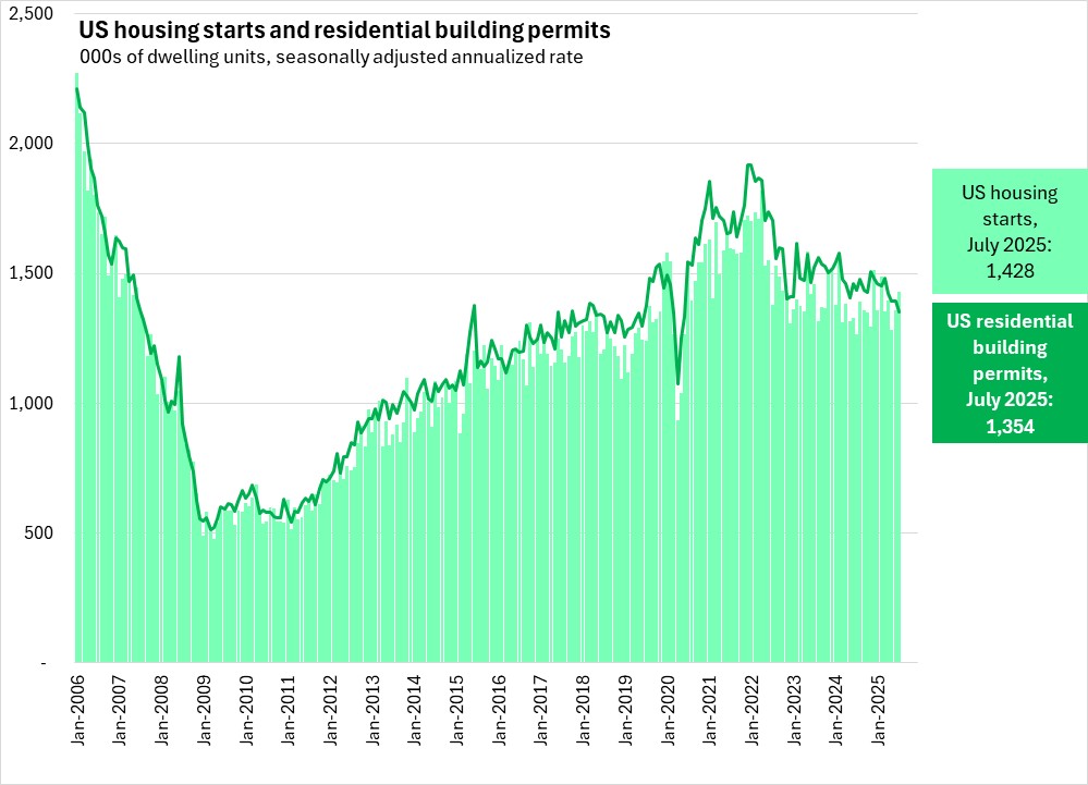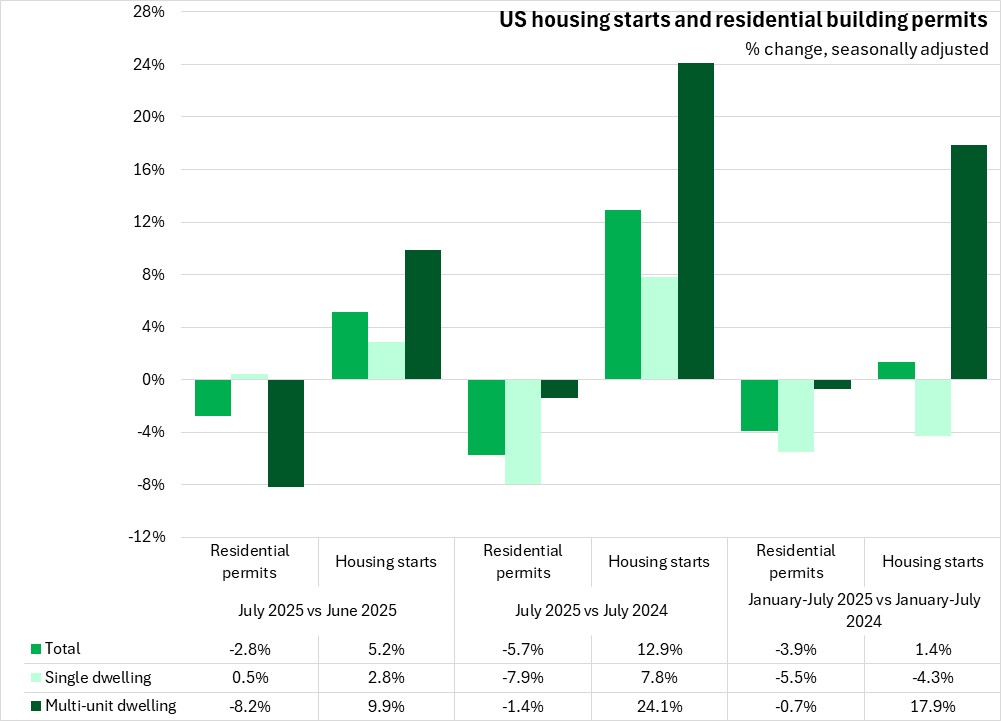 In the first seven months of 2025, US housing starts were up 1.4%, with declines in single unit starts (-4.3%) and increases in multi-unit starts (+17.9%).