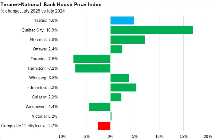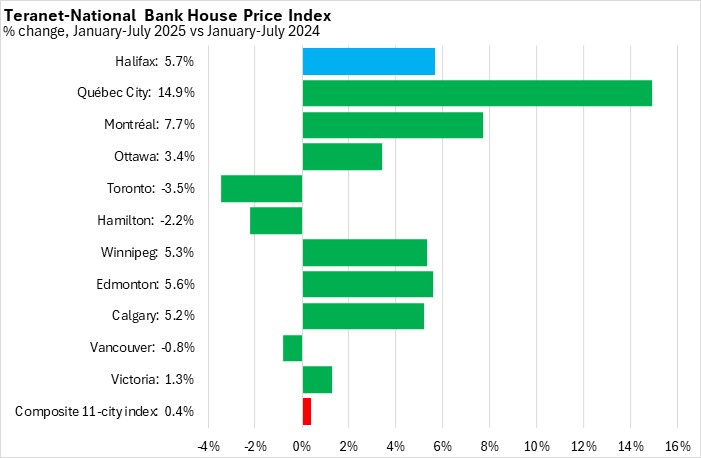 Halifax home prices were up 5.7% in the first seven months of 2025 when compared with the same period in 2024. This was above the 11-city index average growth in resale home prices of 0.4%. Every city in the index except Toronto, Hamilton and Vancouver reported gains in home prices, with Québec City reporting the largest increase.