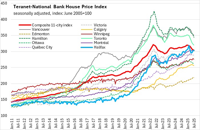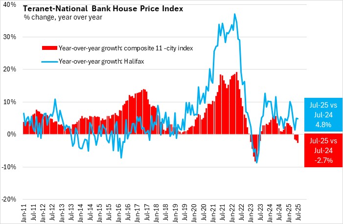 Halifax resale home prices were up 4.8% year-over-year. Prices for the 11-city composite index were down 2.7%, the third consecutive month of year-over-year declines despite gains in eight of 11 urban centers. Prior to May 2025, the 11-city composite index hadn't reported a decline since July of 2023. Québec City reported the fastest pace of growth over July 2024 while the fastest decline was in Toronto followed closely by Hamilton.