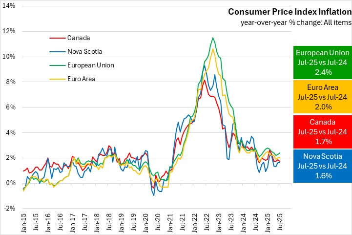 Excluding the impacts of energy, food, alcohol and tobacco prices year-over-year inflation rose 2.5% in the European Union and 2.3% in the Euro Area in July 2025.
