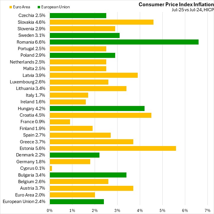 The inflation rate rose to 2.4% in the European Union and remained at 2.0% in the Euro Area in July 2025.