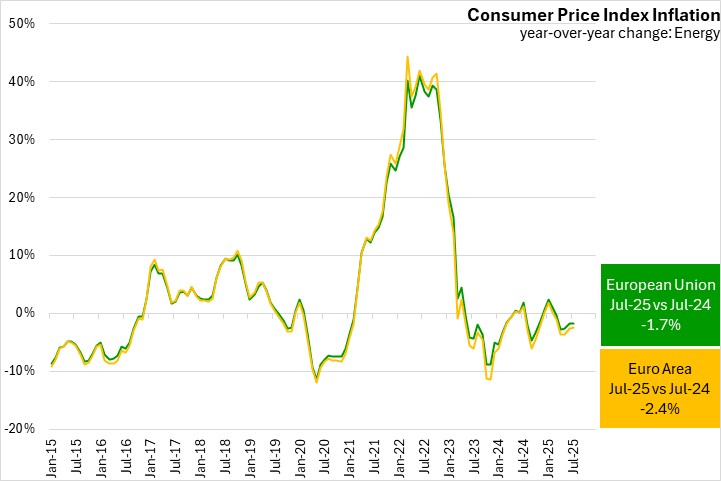 Energy price inflation was -1.7% in the European Union and -2.4% in the Euro Area in July 2025.