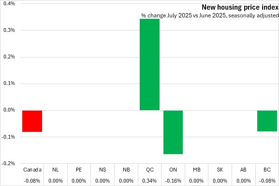 Nova Scotia new housing prices were unchanged from June to July 2025. Nationally the price of new houses declined 0.08%, with two provinces reporting declines and seven provinces unchanged from the previous month. Ontario and British Columbia posted declines and Québec posted only increase.