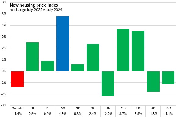 Nova Scotia’s new housing prices increased 4.8% from July 2024 to July 2025. Nationally, prices were down 1.4%.
