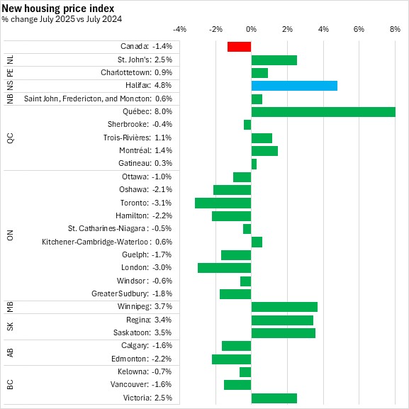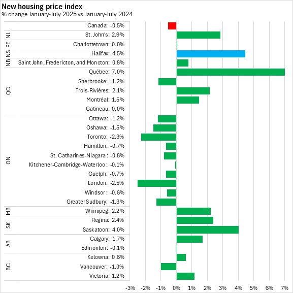 Halifax new home prices increased 4.8% year-over-year in July 2025. Among Census Metropolitan Areas, new housing prices were down year-over-year in fourteen cities, with Toronto and London reporting the largest declines. Québec City and Halifax reported the largest year-over-year gains.