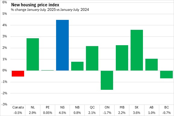 In the first seven months of 2025, Nova Scotia's new housing price index was 4.5% higher compared to the same period in 2024, the fastest increase among provinces. Nationally, new housing prices were down 0.5% year-to-date with gains in eight provinces. Year-to-date declines in new housing prices were reported in Ontario (fastest) and British Columbia.