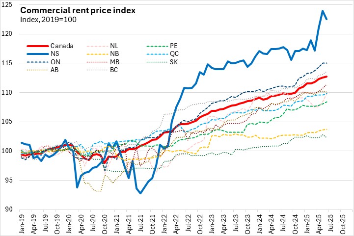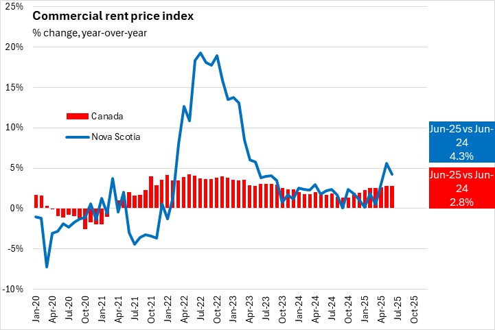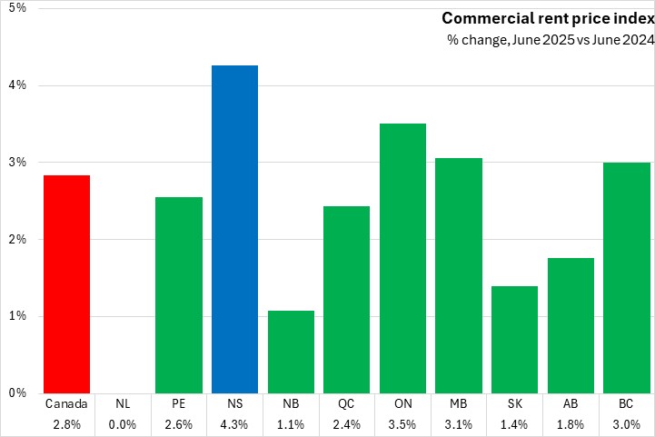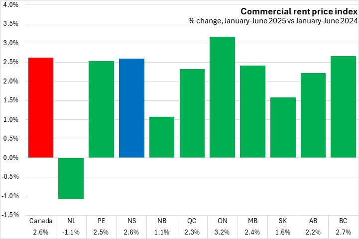 Comparing the commercial rent price index for the first half of 2025 with the same period in 2024, Nova Scotia's commercial rents were up 2.6%. The national increase in commercial rents was 2.6% with gains in all provinces except Newfoundland and Labrador, with the fastest rise in Ontario.